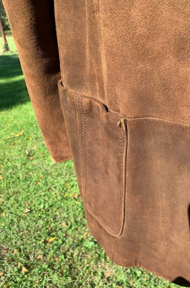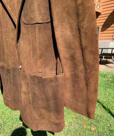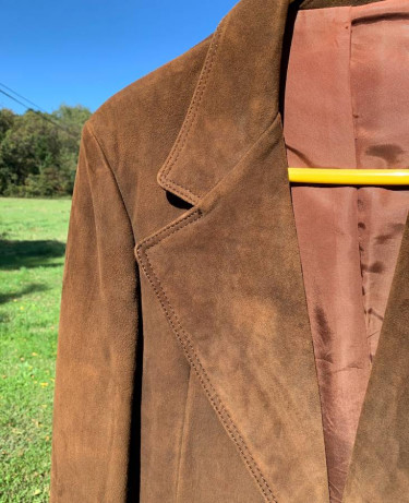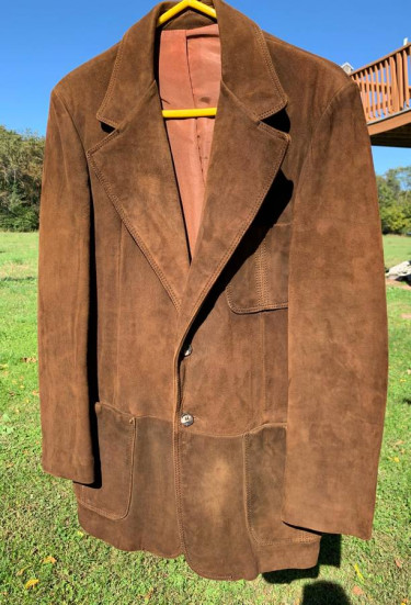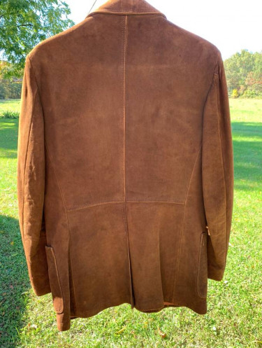 Brown suede leather men’s blazer. Probably from the mid to late 70s. Been hanging in closet for many years. Time for someone else to get some wear out of it. All seams intact. Could use a professional cleaning for best appearance. Some spots on lining. Some fading where lapel folds over. Can’t read size ...