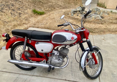 The B100P or “Magnum” as it was known in the US. It was first introduced in 1966. The model was fairly typical of Suzuki’s lightweight production bikes utilizing a pressed steel spine frame equipped with swing arm rear suspension and telescopic forks. The single cylinder two stroke engine was fitted with S...