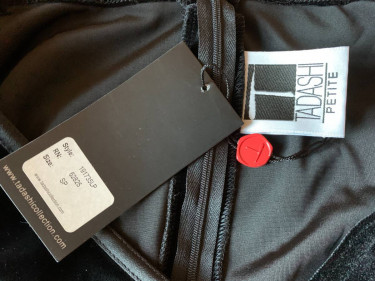 Tadashi Collection Formal Gown Made in USA Black Velvet V-Neck Size PS NEW Be simply fabulous in this sensational black velvet evening gown. Sophistically tailored in a high stretch velvet. Beautiful detail at wast that cinches to a rhinestone broach. Long sleeve with a v-neck and maxi length. Measurements...