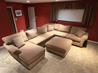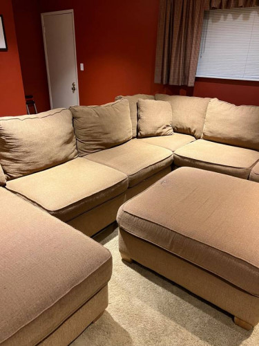 Used 5-piece sectional sofa set. Right end chase lounge piece is 37" wide and 60" deep. Best seat in the set. Middle two-cushion piece is 60" wide and 37" deep. Corner piece is 37" wide and 37" deep Left end piece is 71" wide and 37" deep. Ottoman is 37" by 37" and opens for storage. Comes with thr...
