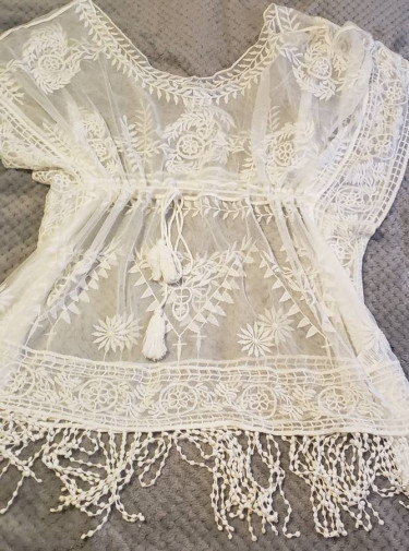 Going on vacation? Brand new tankini tops. Tags still on them. Never wore. Royal blue is size 12. Other 2 are XL. $8 each. ($49 - $50 tops). Bathing suit cover up. White. One size fits all. But to big for me. $8 Wore once
