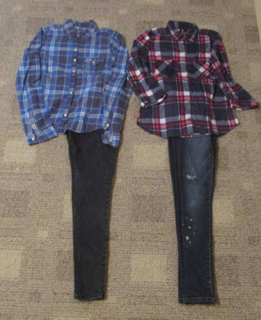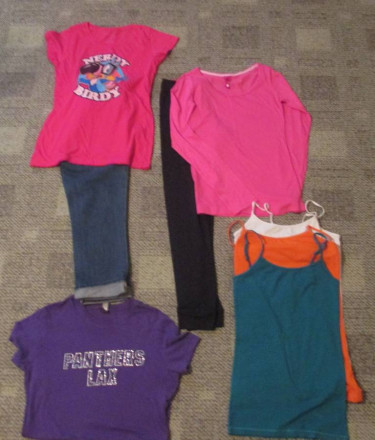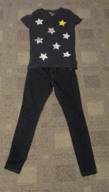 Brand New Forever 21 stretch jeans sz waist 24 Abercrombie & Fitch navy w/ stars s/s shirt M Faded blk jeans cuts sz 1 Black stone washed no cuts sz 1 Just Chill l/s shirt XS In Music We Trust tank S Grey long s/s top with arrow on front & back says Decide what to be & go be it XS Grey &a...