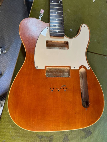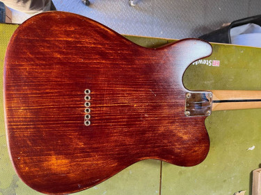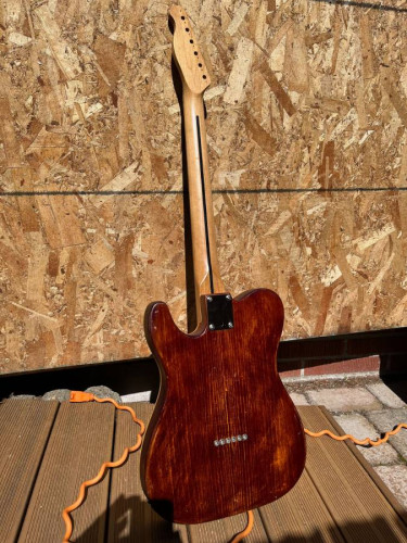 The body is a Warmoth body. Neck is unknown, but straight and has a nice comfortable C shape radius. Only issue is there are extra screw holes at the back of the neck which you won't see when mounted to the body. Overall neck and body are very light. I haven't weighed it, but I would guess under 7lb...