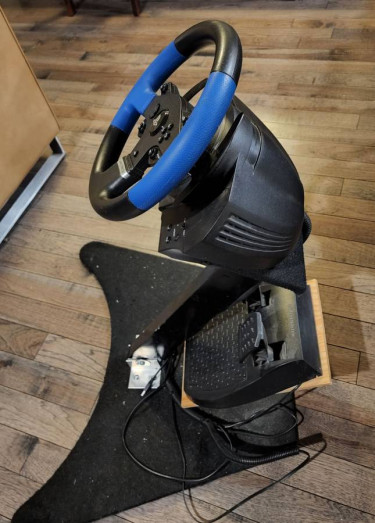 Thrustmaster T150 force feedback steering wheel and pedal setup woth a custom stand for Playstation 4 and 5. Just plug it in and pull it up to your favorite chair and start racing. Gran Turismo Sport GT7, The Crew, and all other racing games. No need to figure out where to mount the wheel and pedals, the...