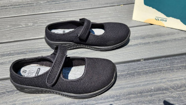 Size 6 1/2 W. Very light and breathable. Worn by my wheel chair bound mother in a nursing home. New condition.