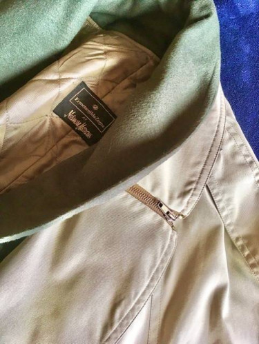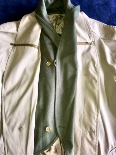 REDUCED! This versatile button & belted trench coat with lapels and wool collar, creates a distinguished look with dress clothes or casuals...work or play. It is multi-layered and has removable lining, top shoulder straps with buttons, cuffs with 2 buttons, and lower back slit vent with button. It ...