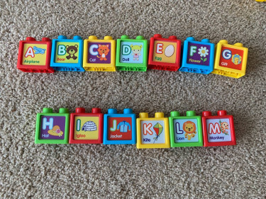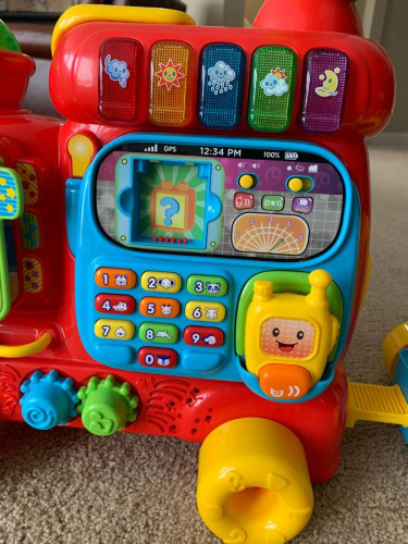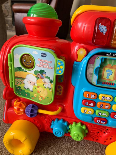V Tech train toy. Has two train “cars” that can be detached. The back of the front car has handlebars so the child can walk behind it/push it. The back car has a seat to ride on. There are 13 (2 sided) alphabet cubes that can be stacked together. They insert into a little square on the side of the balloon ...