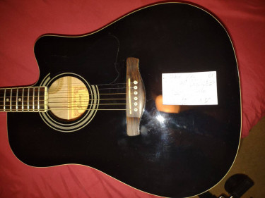 Has all the bells cutaway, electric, name brand,frets are fine, low buzz-free action cast tuners.ebony new strings. AEQ200 3 band equalizer. Has some very light scuff marks nothing distracting & one small mend at bottom see pics. Meet in Spring any afternoon plug and play before you pay no haggle price a...