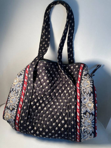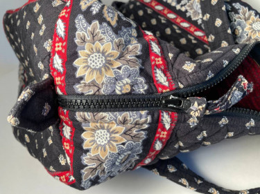 Large Vera Bradley Duffel Bag, Vintage retired Black floral pattern, Quilted Cotton Overnight bag, red interior and very pretty style and design. Versatile and stylish, features: 2 long quilted straps, zippered closure with a fabric tie on the zipper pull, one large pocket on the end, inner tag states Vera Br...