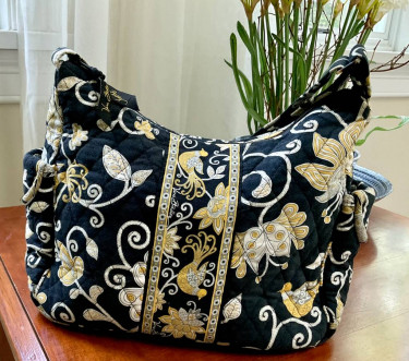 Beautiful Vera Bradley Shoulder Handbag Adjustable Tortoise shell pattern Side exterior pockets on either side Exterior pocket zips for security Full zip enclosure on top with logo fabric grab tags 3 reach pockets inside