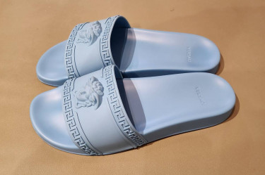New without box..Versace presents forward-looking design with these light blue Medusa slides. These Italian-made slides give a luxe take on the traditional beach flip-flops. Versace iconography features on the top, with a Medusa head logo visible. Elsewhere, the Medusa slides feature a flat rubber sole and an...