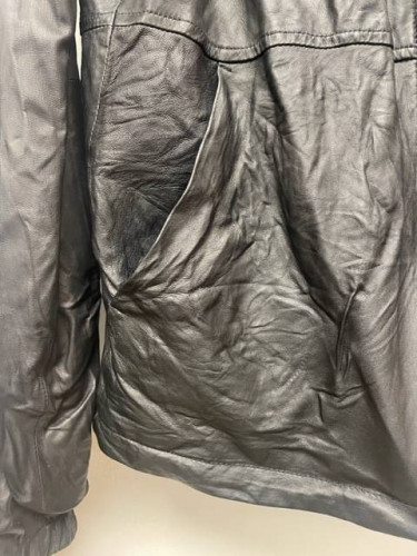 Very nice VINCE Womens Jacket, Sz Medium... in excellent condition. Crinkled Black Lamb Leather on one side and a Gray Polyester blend on the other side. Zip front. Hooded. Pockets. Elasticized sleeve ends. Adjustable tabs at the hood and one at the lower side. Style M25314298 Self is 100% Genuine Lamb L...