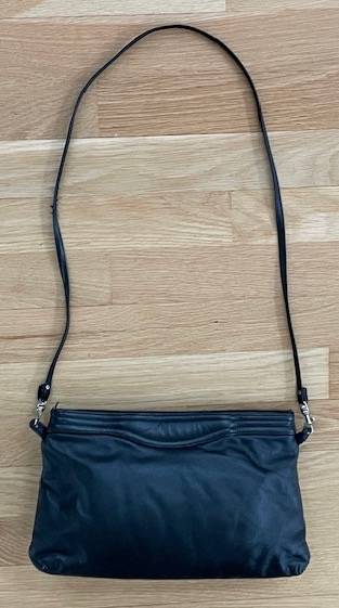 This is a vintage Aigner black crossbody bag. It has a zipper across the top and a pouch on the inside. The zipper works fine but the pull on the end has broken off. A small leather or metal pull could easily be placed on the zipper if some wanted (however it is not needed to for the zipper to work). ...