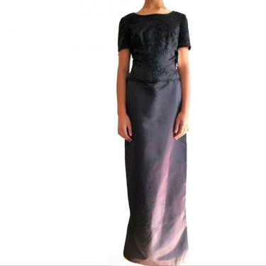 This beautiful black one piece evening gown has an attached overlay embellished with beads & a front rounded neckline with short sleeves. The skirt has a 20" kick slit in the back for extra mobility. Also includes extra beads. Great as a bridesmaid and/or Mother-of-the-Bride Dress. This is also a perfect ...