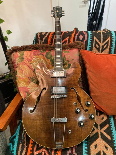 I have an amazing 70's Greco guitar here. I believe the Greco model number is SA-500 or SA-700 if you want to research them but it's basically a clone of the Gibson 335, except for the fact that this guitar is fully hollow. So, in that sense, it is actually closer to a Gibson 330 and it's much lighter weight ...