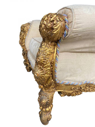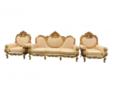 Hello. I’m selling a set of vintage Spanish style carved sofa and three matching arm chairs. They were beautifully carved and finished in real gold leaf. They have their original silk fabric and can easily be reupholstered if so desired. They are strong and comfortable and have a nice patina to the finish. So...