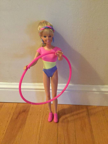 Vintage Hula Hoop Maxie for Sale! This cool Maxie Doll comes with her own hula hoop, ready for whirling, twirling fun! She is wearing a bright leotard and has pink sneakers, hoop earrings, and a pink and blue headband. She's 11.5” tall and has poseable legs. The original directions and “training hoo...