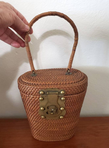 Vintage Rattan Basket Asian Design Purse with Brass Hardware It has brass hardware on the front, back and top. The brass hardware on the front has a fish that secures or locks it in place. Great design. It measures 8" tall without the handle and 14 3/4" with the handle. It is 7 1/2" wide by 5 1/2" deep. ...