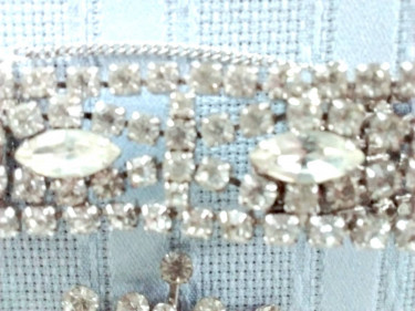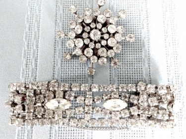 Vintage Rhinestone Bracelet and Starburst Brooch Pin - No discoloration or compromise The bracelet is 1 inch wide and measures 2 inches round The bracelet including insert clasp and chain are in like new condition. The clasp release has two accent rhinestones. The rhinestone starburst brooch - pin is...