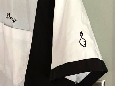 Vintage Style Bowling Shirt Black and White - Medium embroidered with the name Donny and a bowling pin logo on sleeve Tag says M measures 24 inches from top front of buttoned collar to bottom of front 23 inches across chest from underarm to underarm when laid flat Click the "more ads by t...