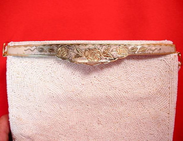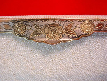 Vintage White Beaded Evening Bag Seed Pearls Silver Etched Floral Clasp Japan - vintage white seed faux? pearl evening or bridal purse - made in Japan circa late 1950s to mid 1960s - top lift-up magnetic bar closure which runs the length of the bag is silver & gold metal ? etched with floral desig...