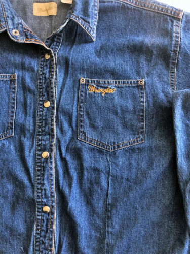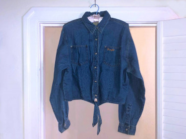 Vtg Wrangler Western Wear Denim Shirt Women Sz XL Cropped Top with Tie Front Snap button front Snap button Chest Pockets Cropped Tie waist Long Sleeve Blue 100% Cotton Pre-owned, vintage condition. No rips or stains. Approx. Measurements (Measurements are taken lying flat) Pit to Pit ~...