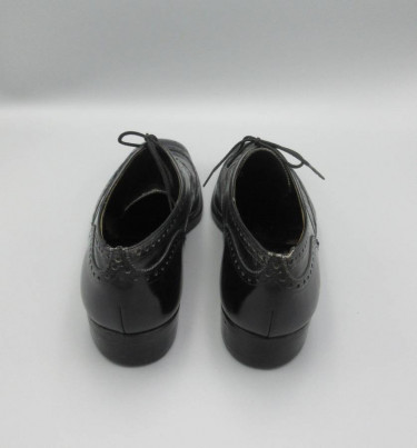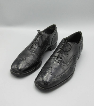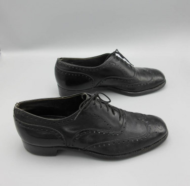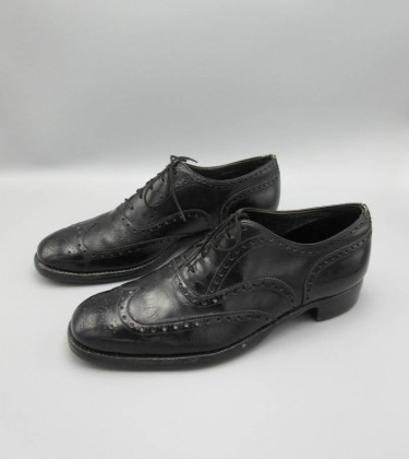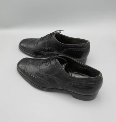 This is a vintage pair of men’s Johnson & Murphy Crown Aristocrat black oxford wingtip lace-up dress shoes, B-37085/24-5681-506. The shoes are men’s size 11D. They show signs of age and wear. The tongue of the right shoe is sewn to the body of the shoe, but it does not affect the wearing or the fit of ...