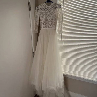 Description: Classic, romantic, and beautiful, BHLDN Watters Frederique features a high scoop neckline, an all lace bodice with 3/4 length sleeves, illusion accents, and an A-line silhouette. This dress was very lightweight and easy to wear! Loved dancing in it and it was so comfortable. It was brand...