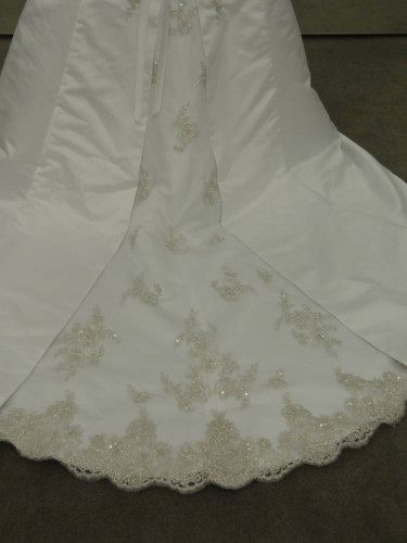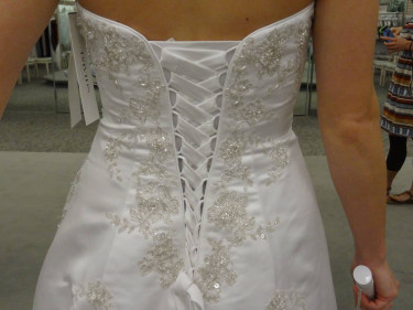 Size 4 embellished wedding dress from David's Bridal. Cream colored. All pictures except the 4th are of a white dress but bride ordered cream color which is the color of 4th picture. No alterations except bustle. Bride was 5'4" and wore 4" heels so no hemming was needed. Dress has corset top and embellished t...