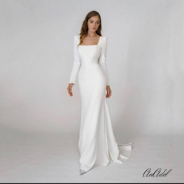 Understated grace- a modest but stunning crepe wedding dress with elegant long sleeves! Gorgeous elongated train in the back. Mermaid shape with a square neckline and keyhole back. This is brand new dress that has never been worn, only tried on! You'll be the first to wear it. There is no tag sewn in, b...