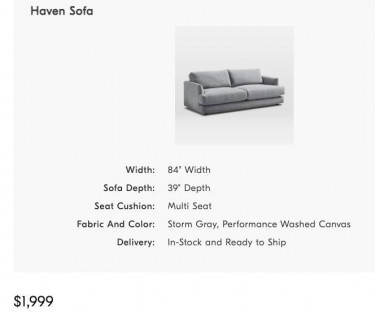 I have a West Elm Haven 84" Sofa (Canvas, Gray) for sale. Opened box in excellent condition. Small snag on the fabric near the bottom of the sofa. Fabric: Performance Canvas, Storm Gray Dimensions: 86"w x 37"d x 32.5"h. Price is pre- tax firm picked up in Hayward. If you are seeing this post, that me...