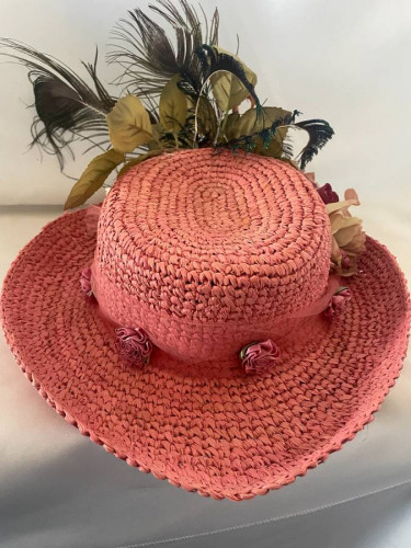 Whimsical Pink Ladies Hat with Peacock Feathers and Flowers. It has a flamingo perched among the flowers and feathers. Flamingo has some feathers on it that are loose or ruffled. Could be repaired or just taken off. I'll leave that up to the buyer. Vibrate colors but, the top might be a little faded due to l...