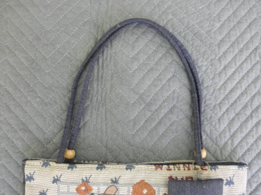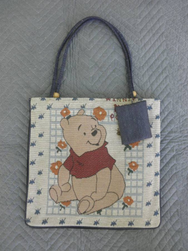 Winnie the Pooh tote bag is new without tags, but still wrapped in plastic. Plastic only removed for photos. Outside shell of bag is made of a tapestry fabric with a blue denim handle and edges. Inside lining is made of black nylon. It has a top zipper closure, one inside zipper compartment, and a zipper alon...