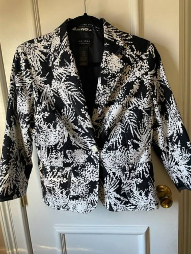 Beautiful classic woman's jacket. Black and white floral. One button closure, fully lined, Liz Claiborne. Great lines with top stitching and pockets. Worn once. pick up only