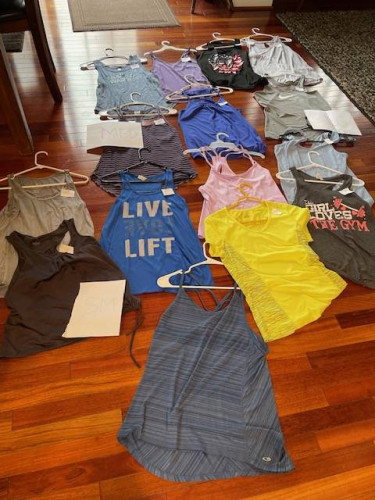 Activewear pants are size sm and med Small Old Navy-1-Black side stripes Victoria Secret -blue Chanpion -Black Under Armour -Gray Medium- Old Navy-1-Black 3/4 length ReboK-Black Head-Blue Below are not marked size- Either small or medium Old Navy Elevated leggings Gray 3/4 length Old Navy B...