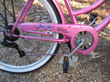 Susan G. Komen commemorative breast cancer beach cruiser. Well taken care of, tuned-up and ready to ride. 7- speeds, comfy saddle, alloy wheels, v-brakes and Blackburn rear rack carrier. $180 new without carrier. Good for riders 5'2" up to 5'9".