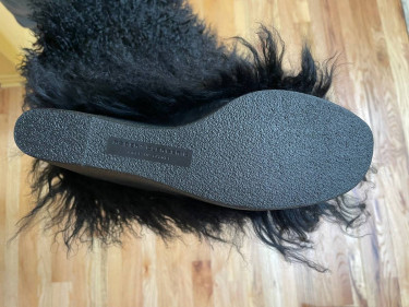 Boots! Designer Women’s Fashion Fur Boots by Robert Clergerie, Paris (made in France). Never worn. Black lamb or sheepskin fur knee-high (high-calf) boots, size USA 10. Black rubber wedge sole—4” high at heel, 1.25” high at toe. Top of boot (shaft) is 17” high from floor. Approx. circumference 13.5”. Bottom e...