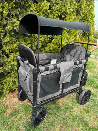 The W4 Luxe Quad Stroller Wagon is a premium stroller designed to seat up to four children with removable, reclining seats magnetic safety harnesses. It offers enhanced comfort with a vegan leather handlebar and an adjustable canopy, while providing plenty of storage through multiple pockets and a removable r...