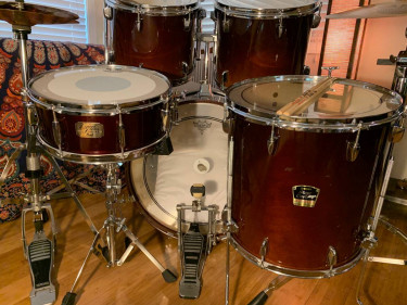 Yamaha Stage Custom Advantage drum set with a Pearl Export Series snare drum excellent condition, tuned 22” bass drum 12”, 13” toms 16” floor tom 14” snare drum Remo Pinstripe bass drumhead new Remo Pinstripe drumheads on the toms new Remo Controlled Sound X coated drumhead on the snare drum ...