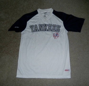 Young Adult's Stitches brand NY Yankees SEWN/STITCHED short sleeve shirt, Size XXL (18) Boys/Mens S White with navy blue sleeves "YANKEES" SEWN on front in gray trimmed in navy blue applique letters Team logo applique SEWN belot team name on front "STITCHES" EMBROIDERED on lower top of right sleeve St...