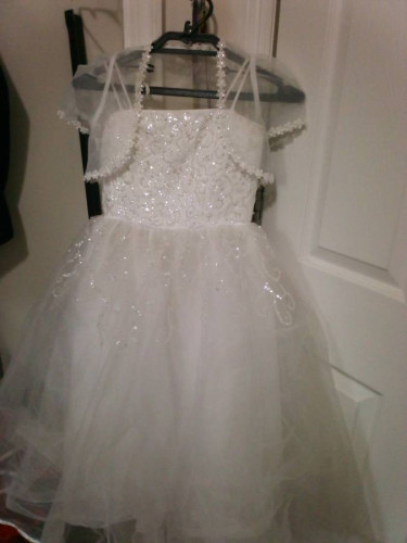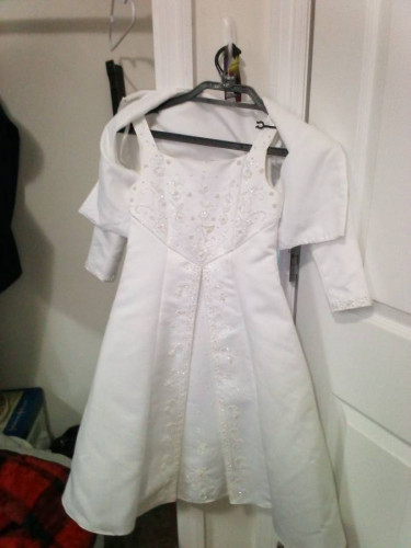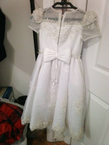 All three dresses are white and frilly. MUST BE DRY CLEANED! One is from Sweet Kids white size 7, one is eggshell white with a little vest on top sz.6 from L'Etoile, in the last one and eggshell white with a beautiful bow on the back sz.8x from JJ Anjorden. $50 a piece willing to negotiate